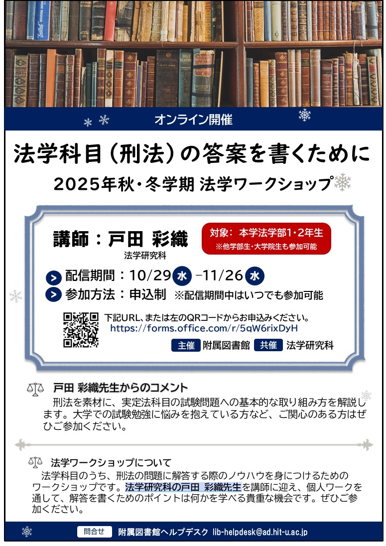 | 10/29(水)~11/26(水) | ワークショップ:法学科目(刑法)の答案を書くために |