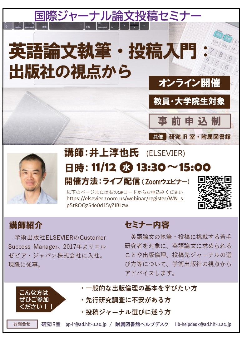 学術出版社ELSEVIER社より講師をお招きし、英語論文の執筆・投稿に挑戦する若手研究者を対象に、英語論文に求められることや出版倫理、投稿先ジャーナルの選び方等についてご紹介いただきます。