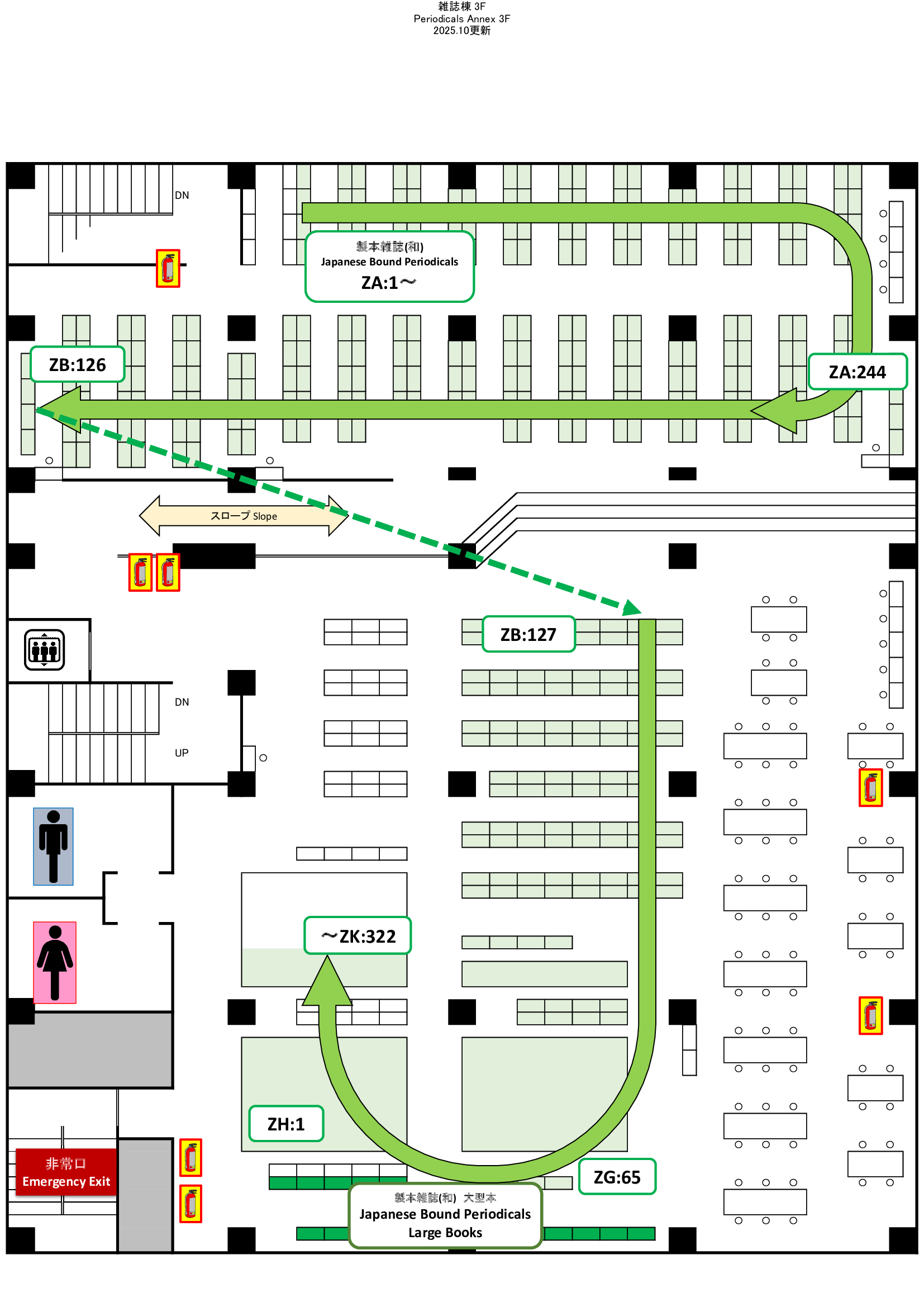 - 中国・韓国書、法令集・判例集、議会資料(コード分類)は雑誌棟地階にあります。
